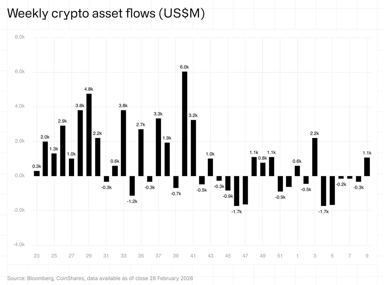 Outflows finally stopped this week and flipped into net inflows of about $1.0 B, ending the five-week $4.0B red streak and signaling a clear shift in capital behaviour. Trading volumes had been weak coming into the week, but renewed accumulation by larger holders and technical resets helped flip sentiment back toward entry points rather than exits. Bitcoin dominated the rebound with approximately $881M in inflows, showing the largest bid presence in some time, while Ethereum posted around $117M, its strongest week since mid-January. Solana continued to lead altcoins with $53.8M of inflows, reinforcing the fact that it’s the go-to alt coin when institutional interest resurfaces.