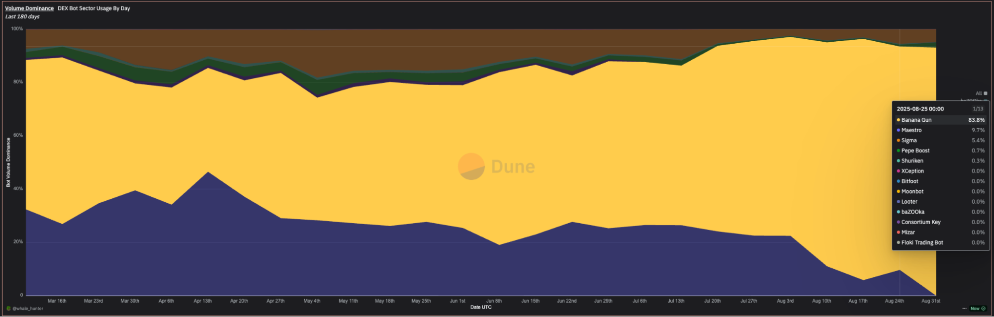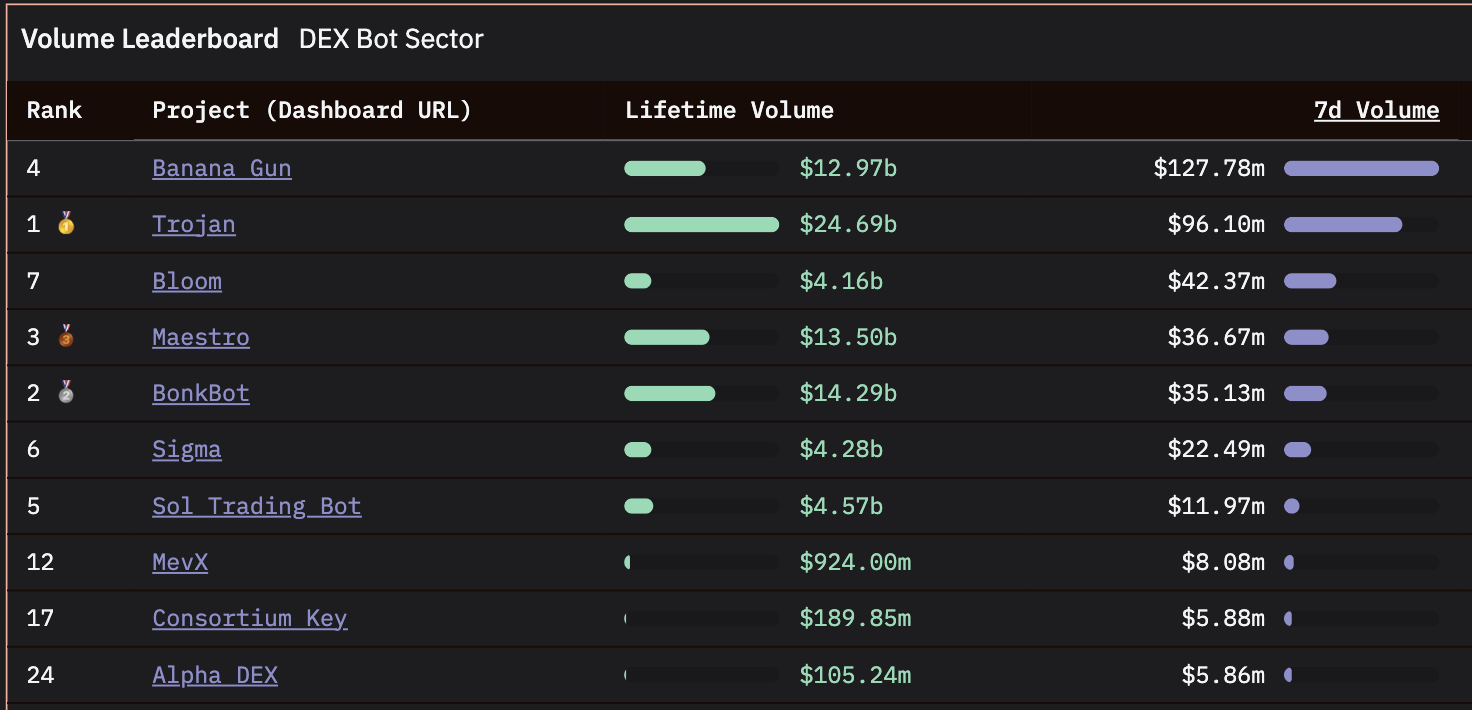 Banana Gun clocked $105.2M in bot volume from August 25th to 31st, down from last week’s $197M.