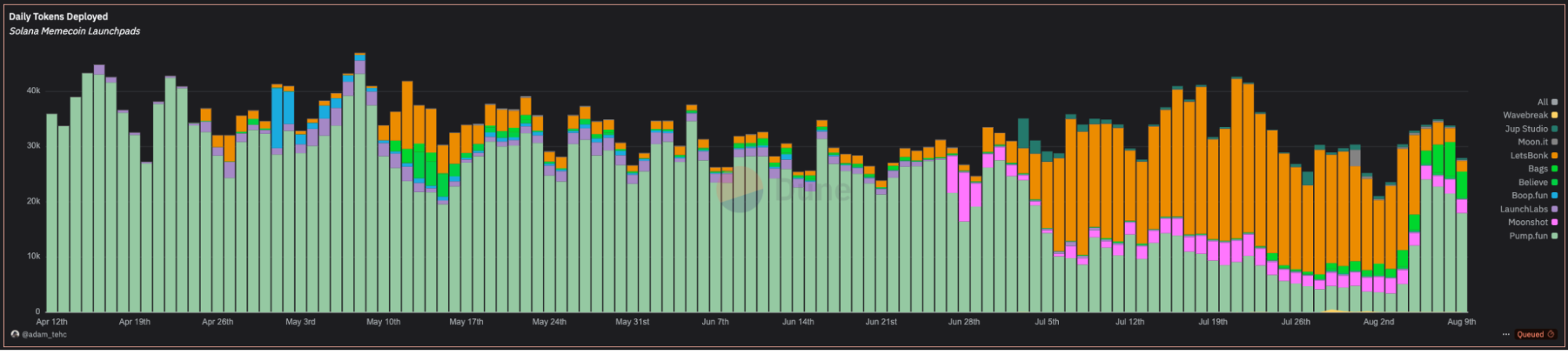 On-chain, the meme launchpad wars are still raging. Pump.fun clawed its way back on Solana, but LetsBonk is still ahead in trading volume. Meanwhile, Base is quietly stealing the spotlight, overtaking Solana in new token launches. And with ETH dominance in bot wars rising, the stage is set for some spicy rotations when alts wake up.