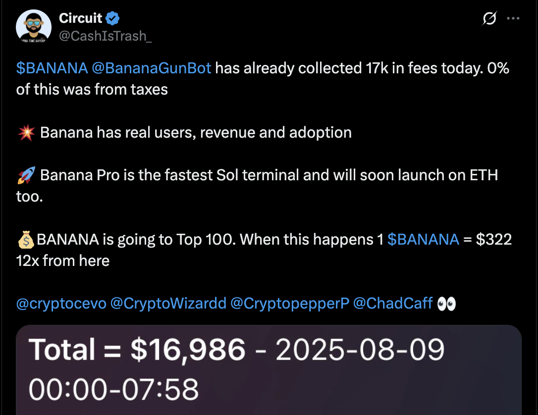 🍌 And of course, @CashIsTrash_ returns with another heavy-hitter. $17K in fees collected in a single day, 0% from taxes, all real users. Called us (correctly) the fastest SOL terminal.