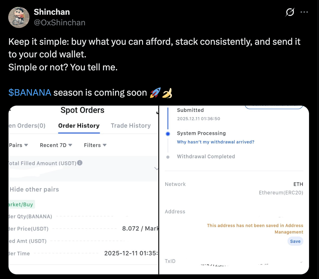@OxSchinchan summed up his entire strategy in one sentence: buy what you can, stack patiently, and send it straight to cold storage. Simple plan, strong conviction. He even backed it up by posting screenshots of fresh Banana orders, just in case anyone thought he was joking. According to him, $BANANA season is warming up.
