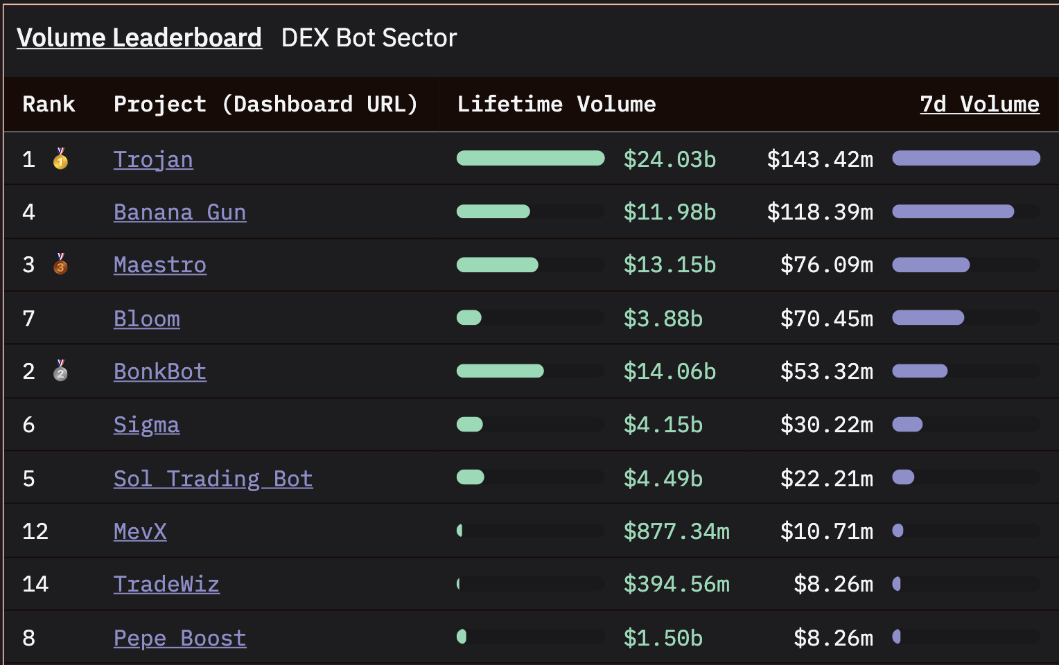 Banana Gun kept its #1 spot for ETH volume, with a 59.8% dominance rate across bots.