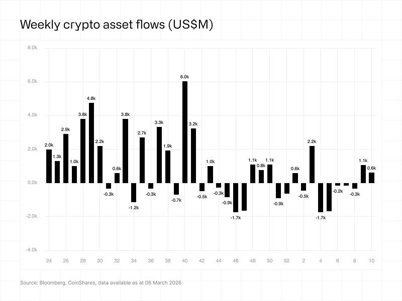 Inflows resumed this week, with digital asset investment products recording about $619M, even as late week sentiment softened and macro is still affecting markets. Strong early-week demand helped lift the asset class overall, with Bitcoin accounting for around $521M of the inflows, while Ethereum $88.5M and Solana $14.6M also attracted capital, showing that size still returns when conditions settle. Despite strong geopolitical pressure, this inflow pattern suggests investors remain opportunistic and willing to step in on dips rather than lock in losses.